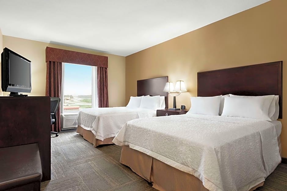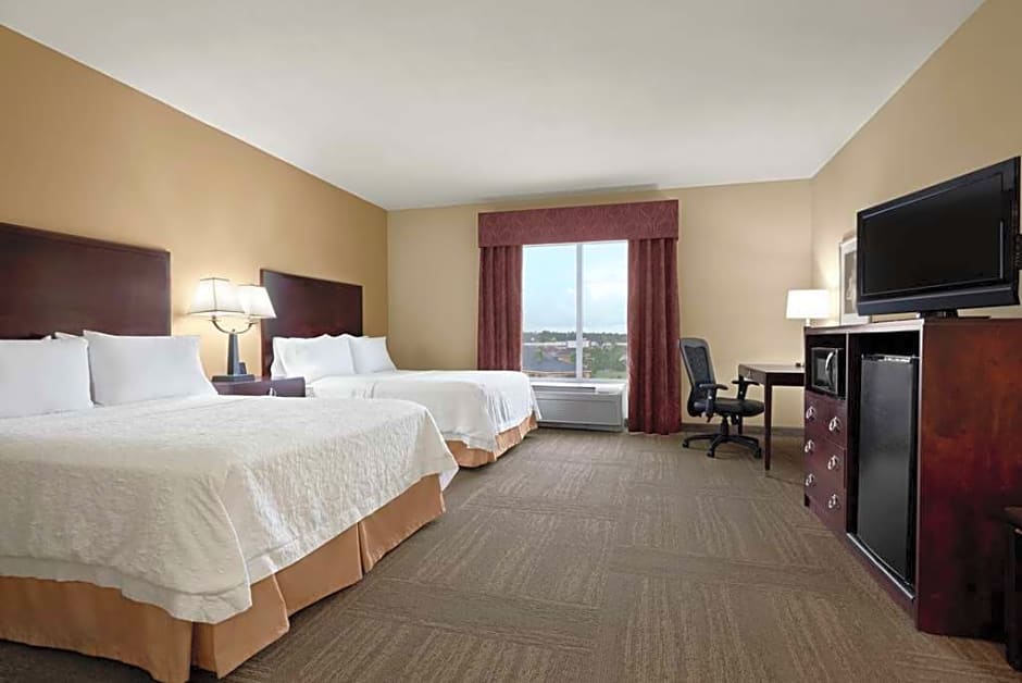 32-inch LCD TV, work desk, coffeemaker, free WiFi access Enjoy a restful stay in this comfortable room with two queen-sized clean and fresh Hampton beds® with a 32-inch TV with HD channels. This room also features a large work desk, a coffeemaker and free WiFi access to allow you to stay connected when on the road. The bathroom contains plush towels and a shower featuring a curved shower rod for added space and light.
